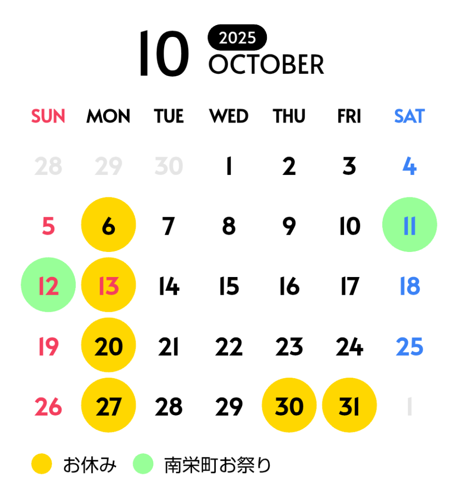 10月カレンダー INFORMATION 10月カレンダーです。 お祭りの季節ですね🥁11日12日は南栄駅近辺で神輿がまわっていますのでご来店ご注意ください。11日ディナーは交通規制の為お休みにして祭囃子、花火を楽しもうと思います。よろしくお願いします🙇